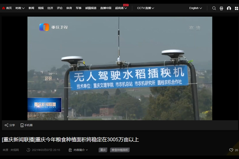 3月7日,重庆卫视《新闻联播》报道了beat365官网研发的“无人驾驶插秧机”助力粮食生产的新闻。