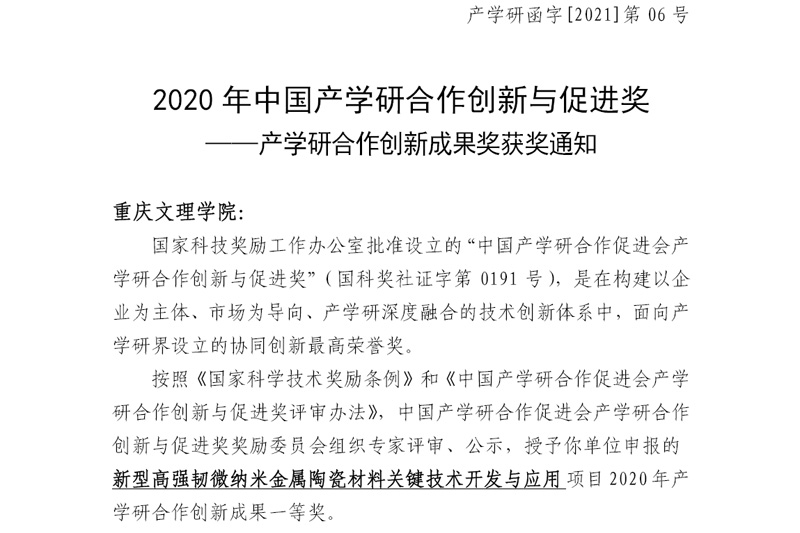 近日,中国产学研合作促进会发布《2020年中国产学研合作创新与促进奖——产学研合作创新成果获奖通知》(产学研函字〔2021〕第06号),beat365官网材料科学与工程学院(新材料技术研究院)姜山副教授牵头完成的“新型高强韧微纳米金属陶瓷材料关键技术开发与应用”项目获得2020年度中国产学研合作创新成果一等奖。