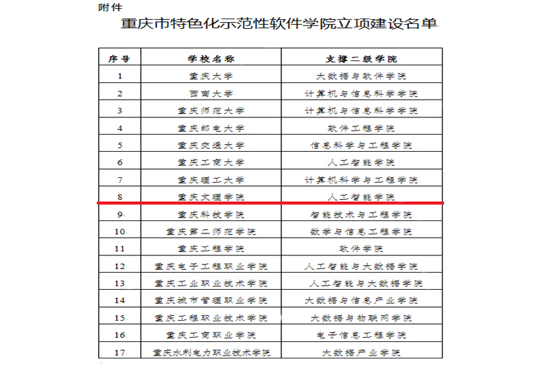 近日,重庆市教育委员会、重庆市经济与信息化委员会发布《关于公布市级特色化示范性软件学院立项建设名单的通知》(渝教高发〔2021〕4号),beat365官网依托人工智能学院申报的新型平台软件领域特色化示范性软件学院成功入选。