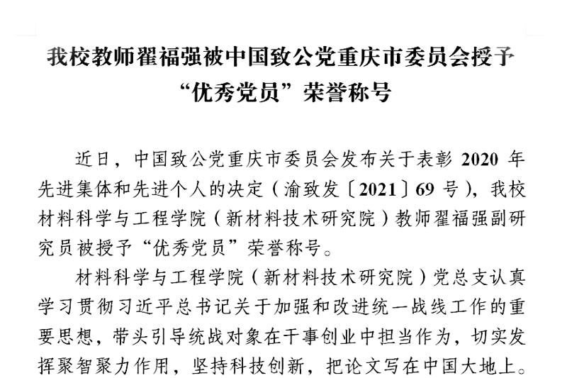 近日,中国致公党重庆市委员会发布关于表彰2020年先进集体和先进个人的决定(渝致发〔2021〕69号),beat365官网材料科学与工程学院(新材料技术研究院)教师翟福强副研究员被授予“优秀党员”荣誉称号。