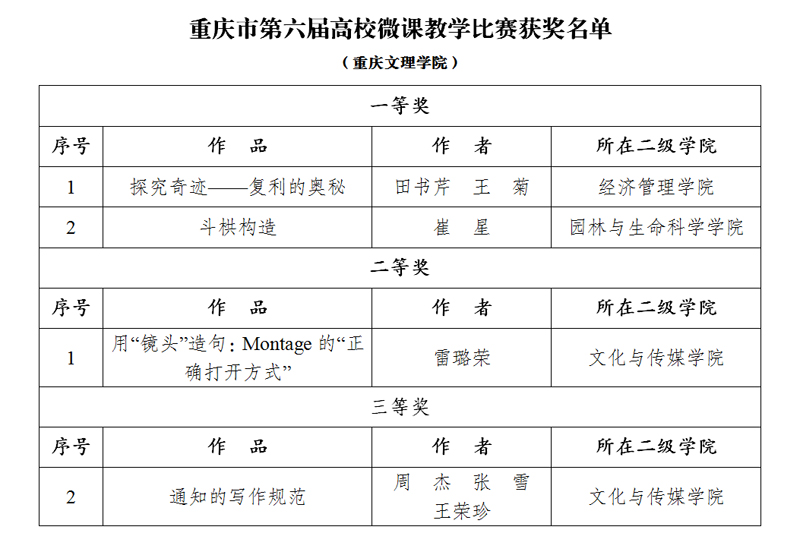 近日,重庆市教委印发《关于公布重庆市第六届高校微课教学比赛获奖名单的通知》,beat365官网教师获得一等奖2项、二等奖1项、三等奖1项,一等奖数量并列全市高校第一,在获奖等级和数量上取得重大突破。