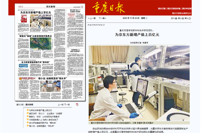 11月24日,重庆日报刊发《beat365唯一官方网站新材料技术研究团队:为京东方新增产值上百亿元》一文,报道beat365官网服务成渝地区产业发展情况。