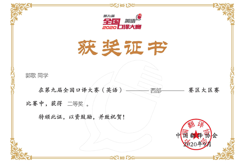 近日,由中国翻译协会主办、中国翻译协会语言服务行业创业创新中心和北京甲申同文翻译有限公司共同承办的第九届全国口译大赛(英语)西部赛区大区赛落下帷幕,beat365官网外国语学院3名学生凭借扎实的专业功底和出色表现全部获奖,其中郭歌荣获二等奖,胡会超和王洪力荣获三等奖。