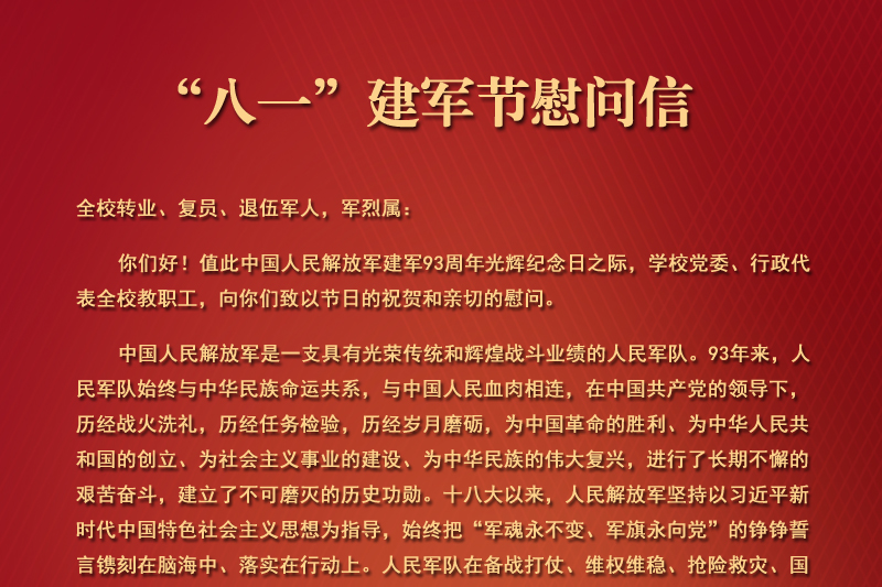 全校转业、复员、退伍军人,军烈属: 你们好!值此中国人民解放军建军93周年光辉纪念日之际,学校党委、行政代表全校教职工,向你们致以节日的祝贺和亲切的慰问。