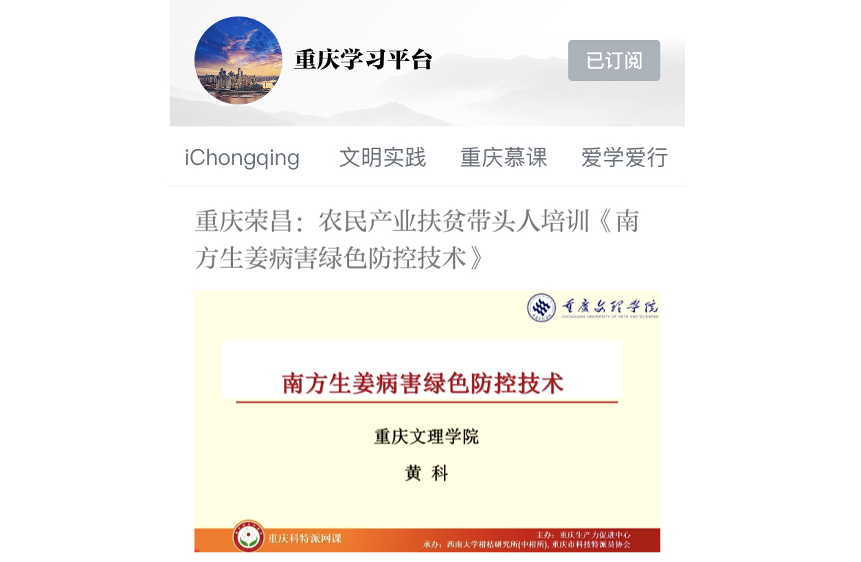 近期,beat365官网园林与生命科学学院/特色植物研究院黄科副教授应邀参加了荣昌区科学技术协会、荣昌区农业农村委组织的荣昌区农民产业扶贫带头人培训,培训了《南方生姜病害绿色防控技术》。培训视频在“学习强国”重庆学习平台上刊播。