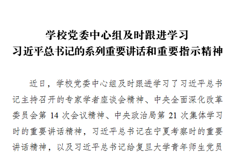 近日,学校党委中心组及时跟进学习了习近平总书记主持召开的专家学者座谈会精神、中央全面深化改革委员会第14次会议精神、中央政治局第21次集体学习时的重要讲话精神,习近平总书记在宁夏考察时的重要讲话精神,以及习近平总书记给复旦大学青年师生党员的回信,习近平总书记关于防汛救灾、禁毒等方面的重要指示精神。同时还集中学习了《中华人民共和国公职人员政务处分法》《中华人民共和国档案法》《中华人民共和国香港特别行政区维护国家安全法》《高等学校课程思政建设指导纲要》等有关内容。