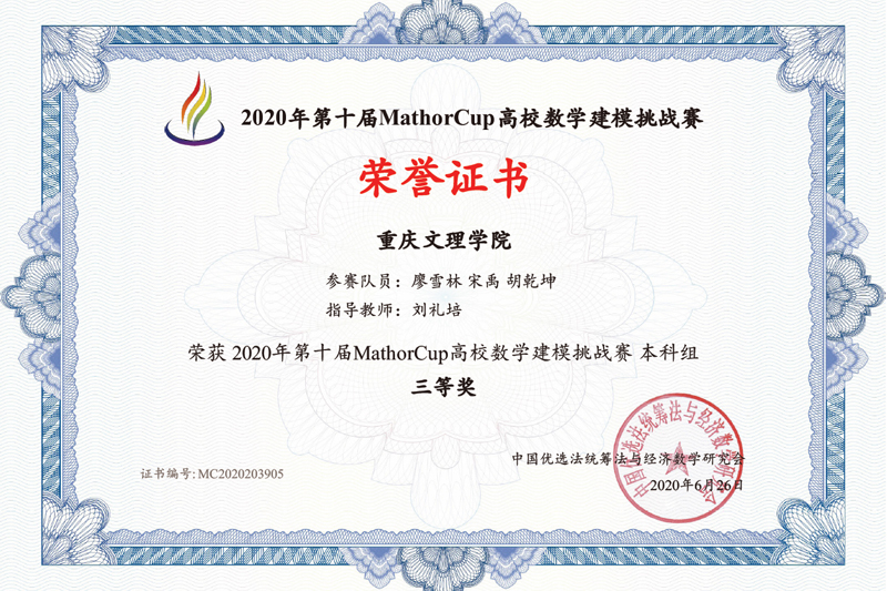 日前,2020年第十届MathorCup高校数学建模挑战赛结果揭晓。beat365官网数学与大数据学院刘礼培老师指导的两支学生队伍参加了比赛,并分别获得全国三等奖,这是beat365官网首次参加该项赛事。