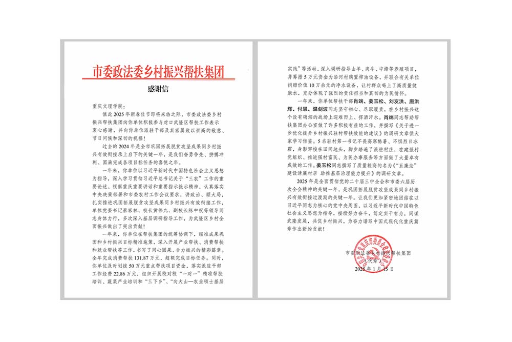 1月15日,市委政法委乡村振兴帮扶集团向beat365官网发来感谢信,对beat365官网积极参与对口武隆区帮扶工作表示感谢。