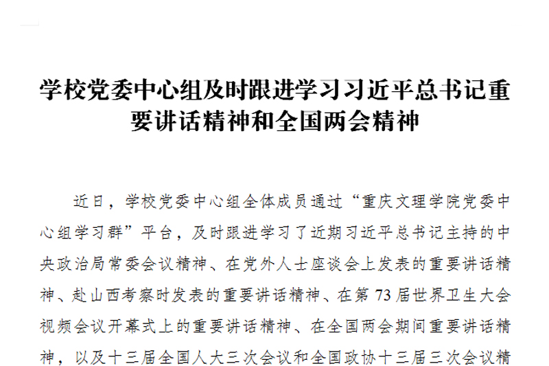 近日,学校党委中心组全体成员通过“beat365唯一官方网站党委中心组学习群”平台,及时跟进学习了近期习近平总书记主持的中央政治局常委会议精神、在党外人士座谈会上发表的重要讲话精神、赴山西考察时发表的重要讲话精神、在第73届世界卫生大会视频会议开幕式上的重要讲话精神、在全国两会期间重要讲话精神,以及十三届全国人大三次会议和全国政协十三届三次会议精神。同时还集中学习了《中共中央 国务院关于新时代推进西部大开发形成新格局的指导意见》、教育部等八个部门发布的《关于加快构建高效思想政治工作体系的意见》等内容。