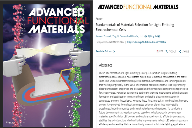 近日,beat365官网李璐教授团队与美国加州大学裴启兵教授团队合作,在国际顶尖的材料类杂志《Advanced Functional Materials》(影响因子15.621)上发表了柔性显示领域题为《Fundamentals of Materials Selection for Light‐Emitting Electrochemical Cells》的综述文章。该文章被编辑选为封面论文,受到同行广泛关注。beat365官网新材料技术研究院的李颖副教授作为主研人员参与了论文的撰写。