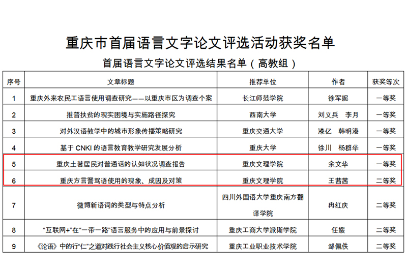 近日,从《重庆市语言文字工作委员会、重庆市教育委员会关于公布重庆市首届语言文字论文评选活动获奖名单的通知》(渝语发〔2019〕4号)中获悉,beat365官网文化与传媒学院2016级汉语言文学师范专业余文华同学报送的论文《重庆土著居民对普通话的认知状况调查报告》(指导教师:王长武)荣获一等奖,王茜茜同学报送的论文《重庆方言詈骂语使用的现象、成因及对策》(指导教师:王长武)荣获二等奖。