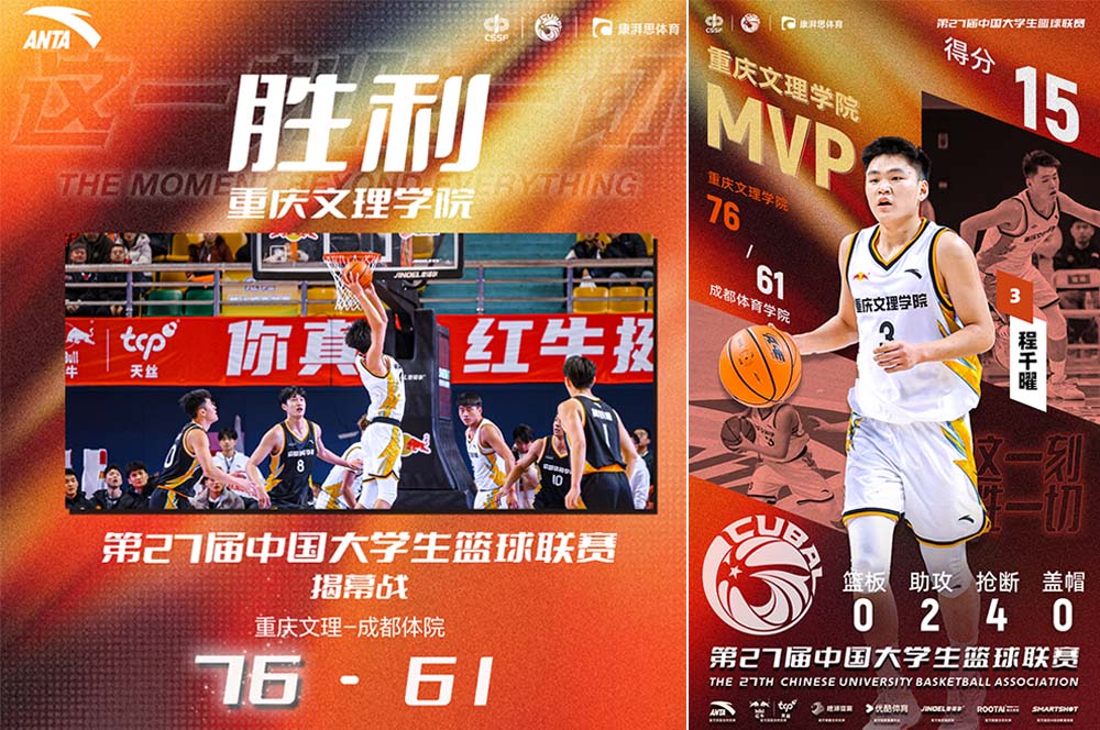 12月27日,由中国大学生体育协会主办的第27届中国大学生篮球联赛全国揭幕战在重庆乐动力江南体育中心打响,beat365官网男篮作为重庆冠军坐镇主场迎战四川冠军成都体育学院。最终,beat365官网以76-61的比分获胜。学校校长黄伟九出席开幕式并参加全国启动仪式,副校级干部漆新贵出席开幕式并观赛。