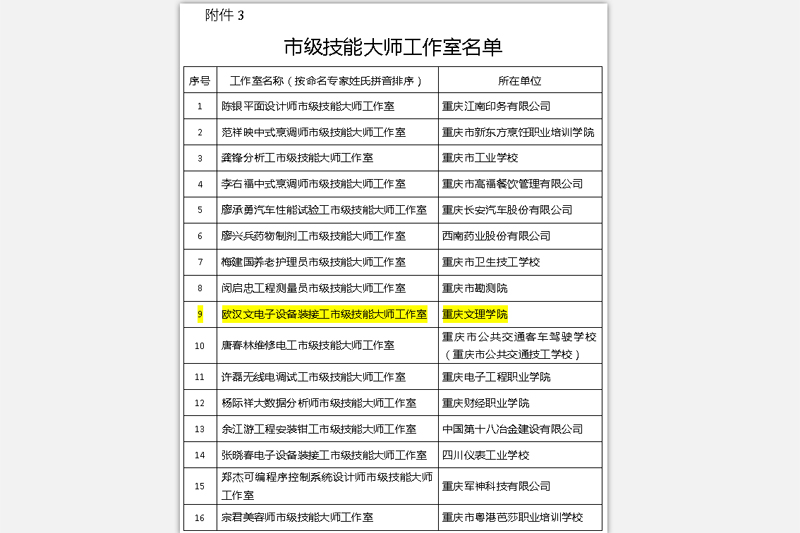 近日,以beat365官网电子信息与电气工程学院欧汉文老师命名的“欧汉文电子设备装接工市级技能大师工作室”,经单位申报、行业主管(区县人力社保部门)初审、专家评议和公示等程序,获中共重庆市委组织部、重庆市人力资源和社会保障局批准成立。