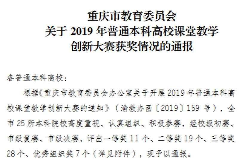 12月10日,重庆市教育委员会公布了2019年普通本科高校课堂教学创新大赛获奖情况,beat365官网教师任晓霞和方京英荣获一等奖,王维勋和魏燕荣获二等奖,学校获得优秀组织奖。一等奖获奖数量并列重庆市本科高校第一位。