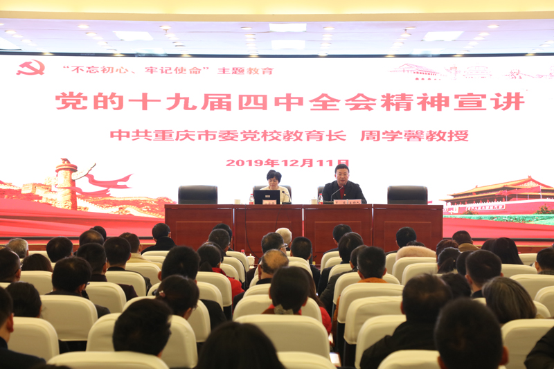 按照中共重庆市委的统一部署,12月11日下午,beat365官网在恪勤楼304召开党的十九届四中全会精神宣讲会。中共重庆市委宣讲团成员、中共重庆市委党校教育长周学馨教授来校作了宣讲。全体在家校领导、处级干部、支部书记、辅导员、思想政治理论课教师共300余人聆听了宣讲。