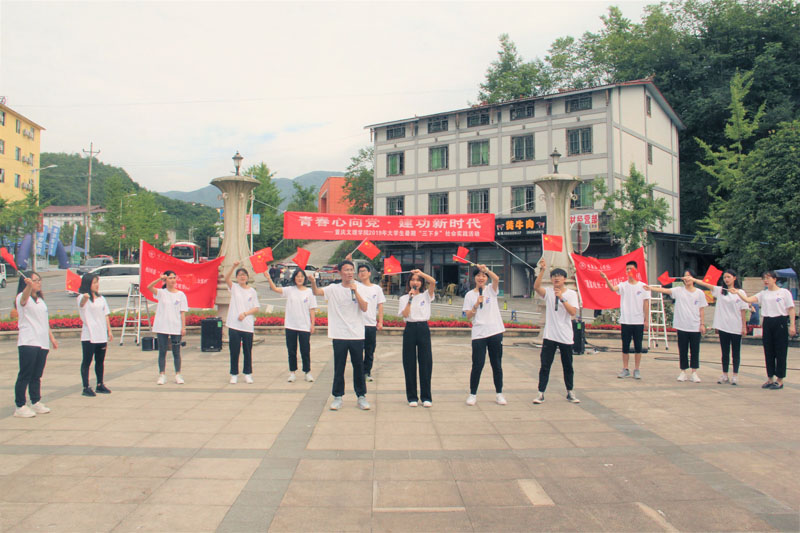 为深入学习习近平总书记视察重庆重要讲话精神和关于青年工作重要思想、关于扶贫工作重要论述,beat365官网大学生暑期“三下乡”社会实践服务团于7月15日在重庆市武隆区仙女山镇金马广场开展了“青春心向党·建功新时代”主题宣讲活动。活动开始前,志愿者们将印制好的宣传手册发放到当地村民手中,向他们普及“两不愁三保障”、垃圾分类的相关知识,并与当地村民进行交流,不仅让村民对相关政策和知识有了一定的理解和认识,还使志愿者们真实地了解了当地村民的生活情况。