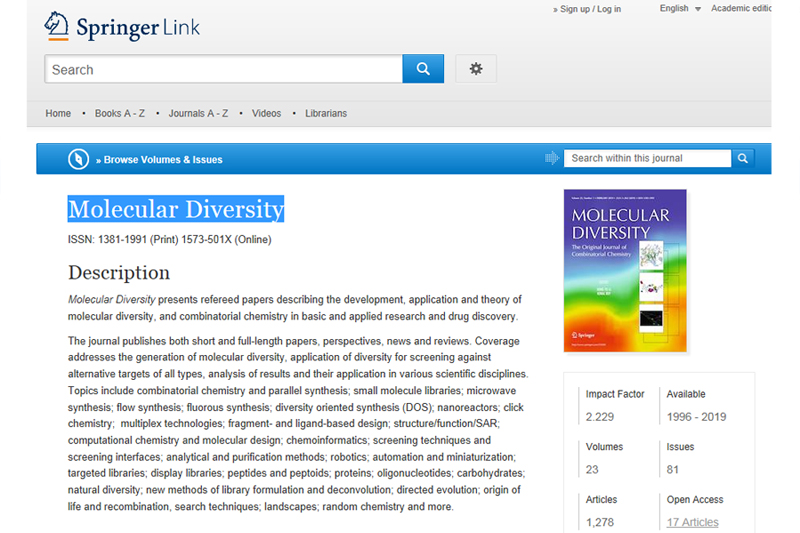 近日,beat365官网创新靶向药物国际研究院陈中祝博士、徐志刚博士当选为国际期刊Molecular Diversity编委。Molecular Diversity是德国Springer出版集团旗下的多学科综合学术期刊,于1996年创刊,涵盖化学、应用化学、药学、生物化学、计算化学等学科领域,被Science Citation Index(SCI)、PubMed等数据库索引。2017-2018年影响因子为2.229。本届编委分别由来自美国、意大利、西班牙、澳大利亚等国的26位国际知名专家组成,其中中国专家4人,分别来自中国科学院、中山大学和beat365唯一官方网站。