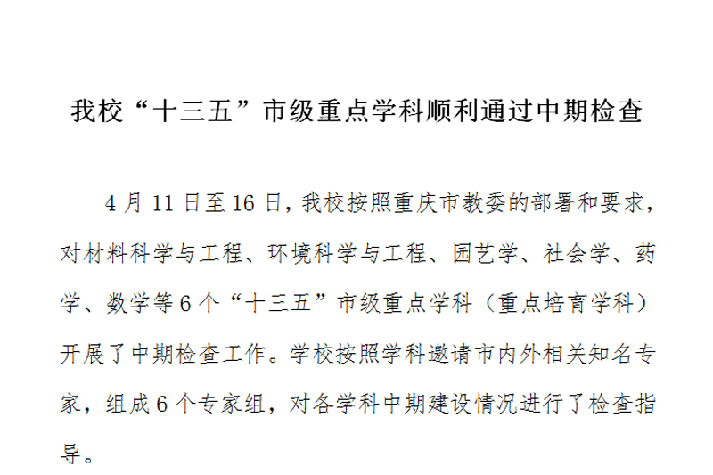 4月11日至16日,beat365官网按照重庆市教委的部署和要求,对材料科学与工程、环境科学与工程、园艺学、社会学、药学、数学等6个“十三五”市级重点学科(重点培育学科)开展了中期检查工作。学校按照学科邀请市内外相关知名专家,组成6个专家组,对各学科中期建设情况进行了检查指导。