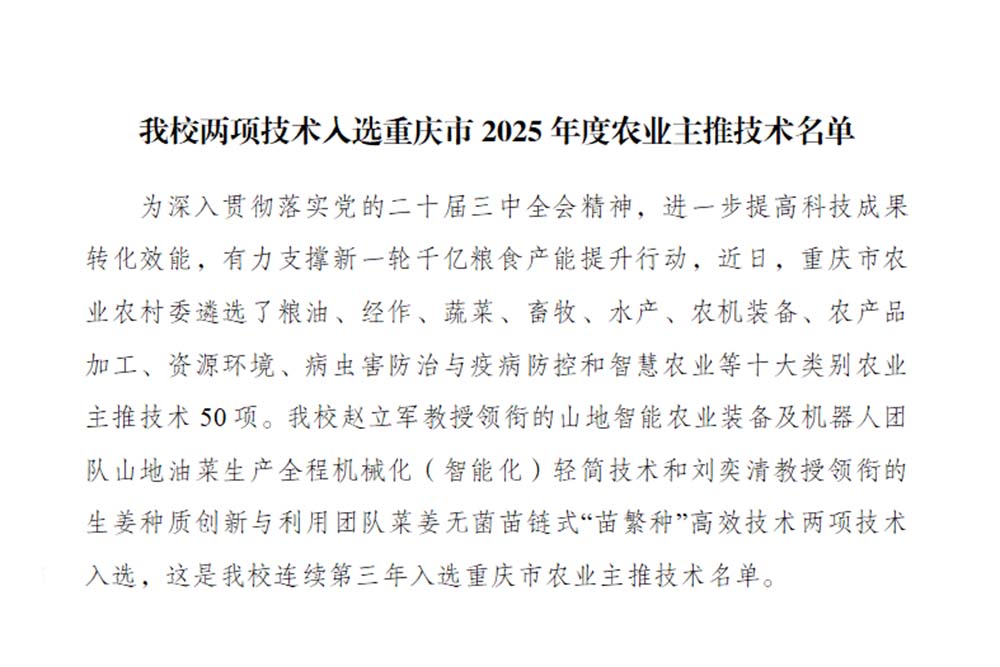 为深入贯彻落实党的二十届三中全会精神,进一步提高科技成果转化效能,有力支撑新一轮千亿粮食产能提升行动,近日,重庆市农业农村委遴选了粮油、经作、蔬菜、畜牧、水产、农机装备、农产品加工、资源环境、病虫害防治与疫病防控和智慧农业等十大类别农业主推技术50项。beat365官网赵立军教授领衔的山地智能农业装备及机器人团队山地油菜生产全程机械化(智能化)轻简技术和刘奕清教授领衔的生姜种质创新与利用团队菜姜无菌苗链式“苗繁种”高效技术两项技术入选,这是beat365官网连续第三年入选重庆市农业主推技术名单。