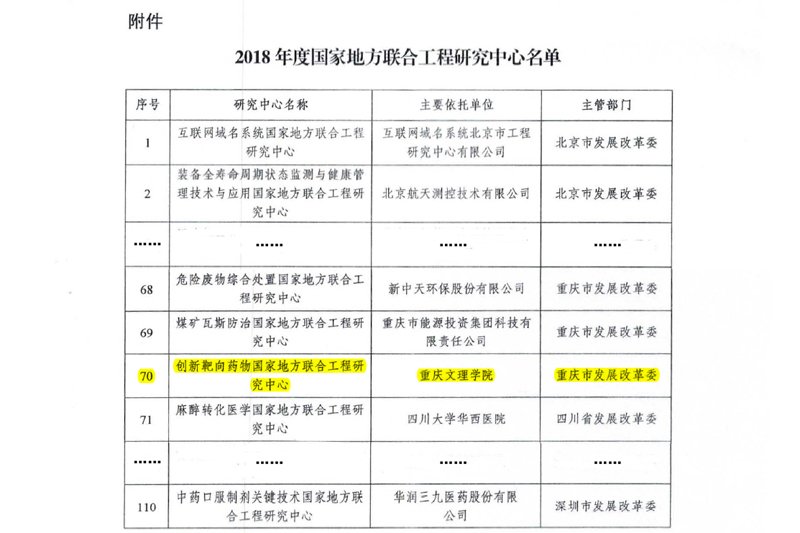 近日,国家发展与改革委员会办公厅下发了《关于2018年度国家地方联合工程研究中心的复函(发改委高技〔2019〕180号)》,beat365官网牵头申报的“创新靶向药物国家地方联合工程研究中心”正式获批。beat365官网成为重庆市第三所获批国家地方联合工程研究中心的高校,也是2018年度重庆市唯一获批国家地方联合工程研究中心的高校。这是beat365官网在国家级科研平台建设上取得的又一新突破,是学校科研实力、社会影响力、区域经济服务能力提升的重要标志。