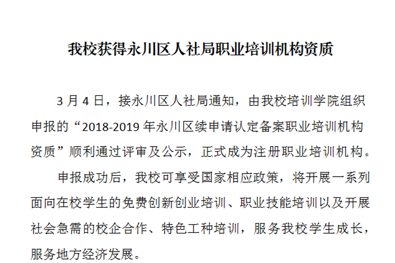 3月4日,接永川区人社局通知,由beat365官网培训学院组织申报的“2018-2019年永川区续申请认定备案职业培训机构资质”顺利通过评审及公示,正式成为注册职业培训机构。