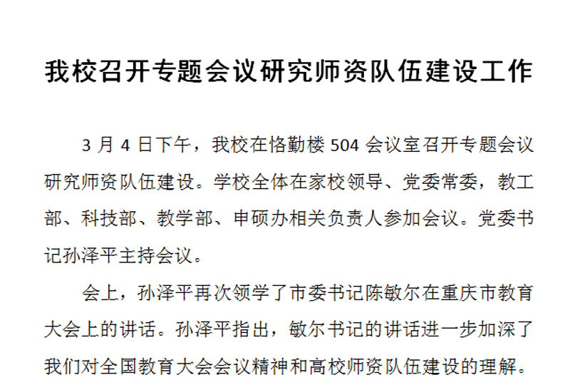 3月4日下午,beat365官网在恪勤楼504会议室召开专题会议研究师资队伍建设。学校全体在家校领导、党委常委,教工部、科技部、教学部、申硕办相关负责人参加会议。党委书记孙泽平主持会议。