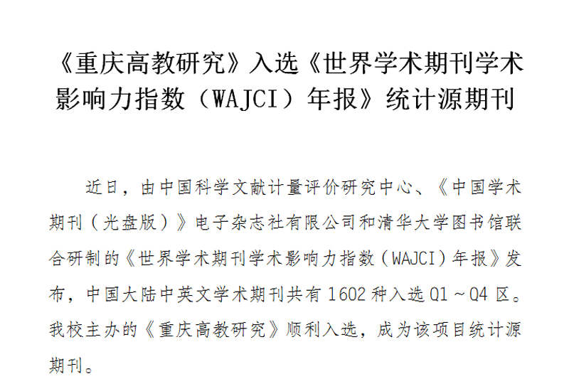 近日,由中国科学文献计量评价研究中心、《中国学术期刊(光盘版)》电子杂志社有限公司和清华大学图书馆联合研制的《世界学术期刊学术影响力指数(WAJCI)年报》发布,中国大陆中英文学术期刊共有1602种入选Q1~Q4区。beat365官网主办的《重庆高教研究》顺利入选,成为该项目统计源期刊。