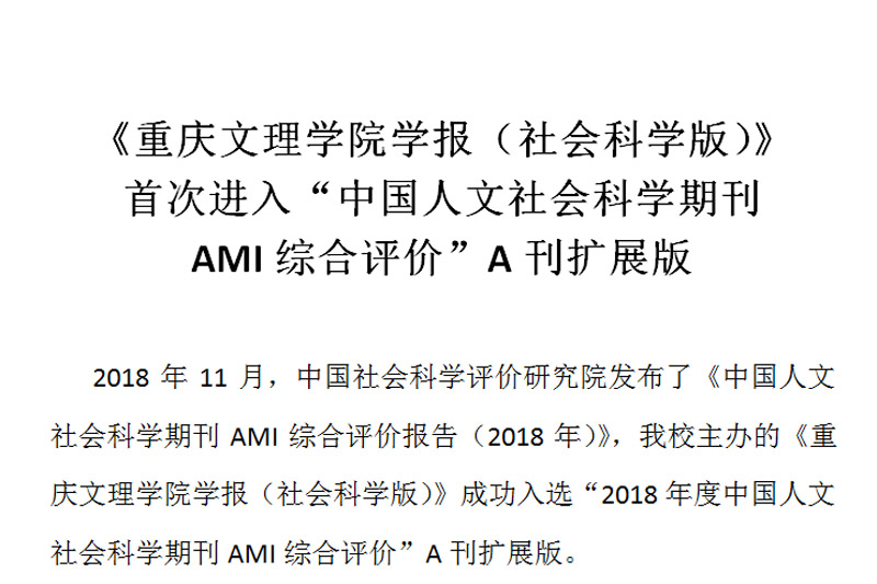 2018年11月,中国社会科学评价研究院发布了《中国人文社会科学期刊AMI综合评价报告(2018年)》,beat365官网主办的《beat365唯一官方网站学报(社会科学版)》成功入选“2018年度中国人文社会科学期刊AMI综合评价”A刊扩展版。