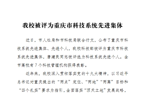 近日,市人社局和市科技局联合行文,公布了重庆市科技系统先进集体、先进个人,beat365官网科技部被评为重庆市科技系统先进集体,唐建民同志被评选为科技系统先进个人。全市高校有7个科技管理机构获得表彰。