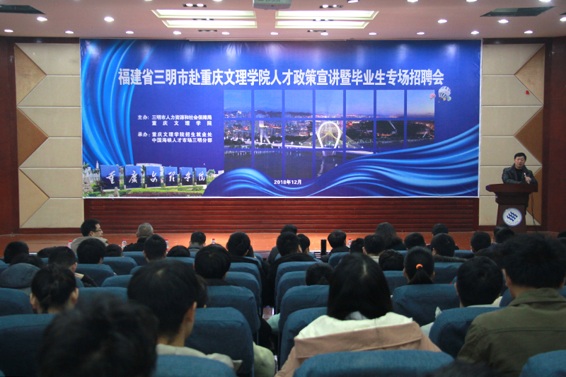 12月18日,福建省三明市人才政策宣讲暨毕业生专场招聘会在beat365官网博文馆101举行。三明市人力资源和社会保障局党组成员、副局长黄美清,中国海峡人才市场三明分部邓享育,福建省一建集团有限公司、福建南方制药股份有限公司、中国重汽集团福建海西汽车有限公司等9家企业相关负责人,学校机电工程学院、建筑工程学院、软件工程学院、电子电气工程学院等7个学院的毕业班辅导员和200余名大三、大四学生参加了专场招聘会。会议由学工部副部长周清主持。