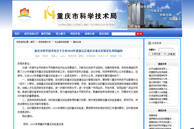 11月19日,重庆市科技局下发《关于公布2018年度新认定重庆市重点实验室名单的通知》,由beat365官网新材料技术研究院、数学与财经学院分别牵头申报的“材料表界面科学重庆市重点实验室”、“复杂数据分析与人工智能重庆市重点实验室”2个平台获得认定。