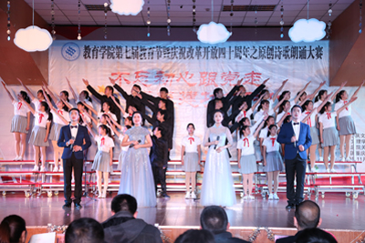 11月18日晚,教育学院主办的主题为“不忘初心跟党走,青春建功新时代”第七届教育节暨庆祝改革开放四十周年原创诗歌朗诵大赛在红河A区活动中心三楼举行。教育学院全体党政领导、各年级辅导员、部分任课教师及学院小学教育专业全体学生共计800余人参与并观看了本次比赛。教工部、党群部、学工部相关负责人担任本次比赛评委。