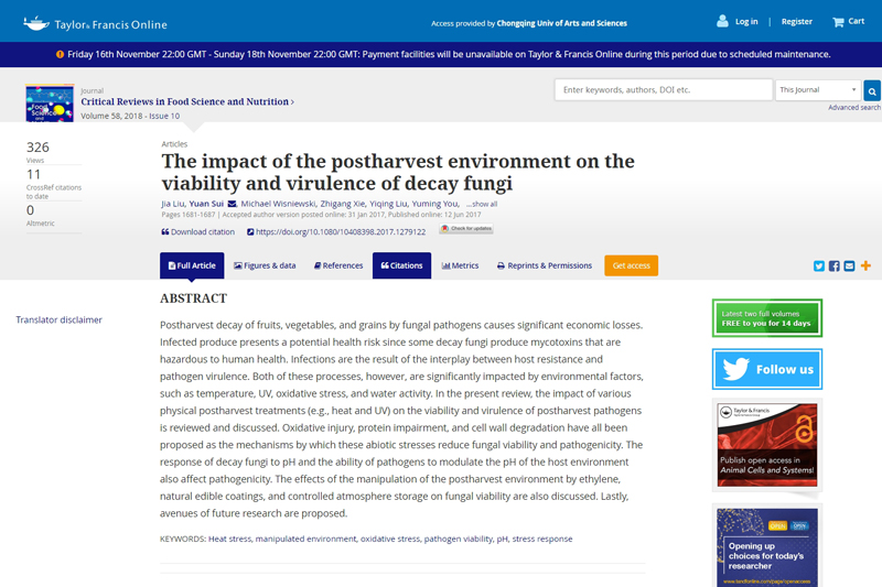 beat365官网特聘教授刘嘉为第一作者,beat365唯一官方网站为第一单位,于2017年6月在《CRITICAL REVIEWS IN FOOD SCIENCE AND NUTRTION》(《食品科学与营养学评论》,IF=6.202,2017)在线发表了研究论文“采后环境对真菌活力和毒性的影响”。11月15日,根据图书馆检索,该篇论文进入农业科学领域全球ESI 1%行列。这是beat365官网近年来园艺学科论文首次进入ESI 1%,标志着园艺学学科建设和科学研究的新突破。