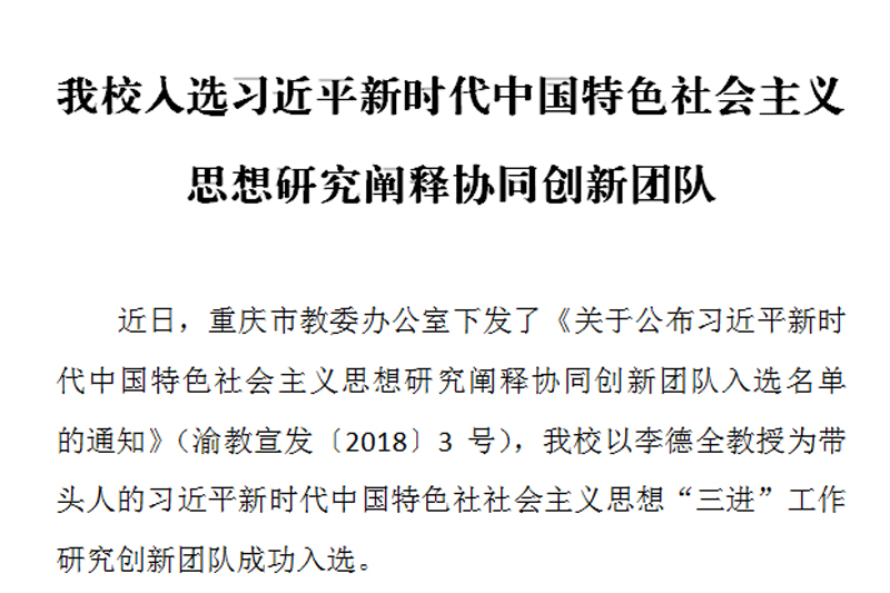 近日,重庆市教委办公室下发了《关于公布习近平新时代中国特色社会主义思想研究阐释协同创新团队入选名单的通知》(渝教宣发〔2018〕3号),beat365官网以李德全教授为带头人的习近平新时代中国特色社社会主义思想“三进”工作研究创新团队成功入选。