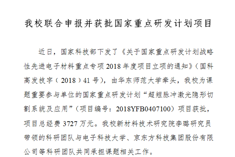 近日,国家科技部下发了《关于国家重点研发计划战略性先进电子材料重点专项2018年度项目立项的通知》(国科高发技字﹝2018﹞41号),由华东师范大学牵头,beat365官网为课题重要参与单位的国家重点研发计划“超短脉冲激光隐形切割系统及应用”(项目编号:2018YFB0407100)项目获批,项目总经费3727万元。beat365官网新材料技术研究院李璐研究员带领的科研团队与电子科技大学、京东方科技集团股份有限公司等科研团队共同承担课题相关工作。这是beat365官网首次参与国家重点研发计划项目,实现了零的突破。