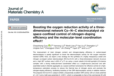 近日,beat365官网特聘教授郭朝中博士、李璐博士团队在英国皇家化学会(RSC)旗下的国际著名材料与能源类期刊Journal of Materials Chemistry A (2017年影响因子9.931,JCR. SCI一区期刊)发表了关于有效提升三维网络Co-N-C催化剂电催化氧分子还原性能研究的最新进展,论文题目为“Boosting the oxygen reduction activity of a three-dimensional network Co–N–C electrocatalyst via space-confined control of nitrogen-doping efficiency and the molecular-level coordination effect”,全文链接:http://pubs.rsc.org/en/content/articlelanding/2018/ta/c8ta03759k#!divAbstract。