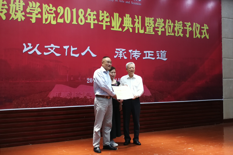 6月21日上午,中文81级校友三峡联合职业大学陈亿董事长及夫人李荣春女士返回母校,参加了文化与传媒学院2018年毕业典礼并向学校捐赠10万元。学校党委书记孙泽平、副校长万书辉,校友总会会长、学校原党委书记钟志奇,校友总会办公室主任谢华琳、CCTV少年中国行重庆小记者站站长曾静、文化与传媒学院相关负责人、离退休教师以及2018届毕业生共计300余人参加了捐赠仪式及毕业典礼。