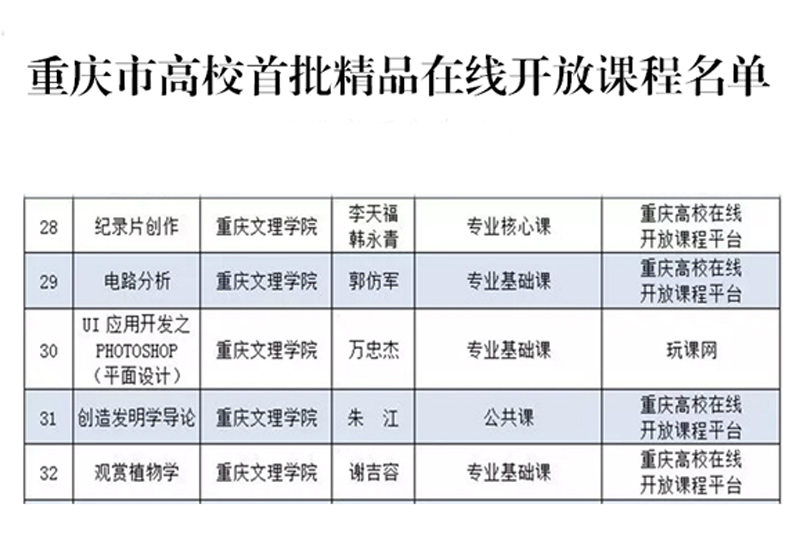 近日,重庆市教育委员会发布了《关于公布重庆市高校首批精品在线开放课程名单的通知》(渝教高发〔2018〕7号),首次推出105门高校精品在线开放课程,beat365官网《纪录片创作》(课程负责人:李天福、韩永青)、《电路分析》(课程负责人:郭仿军)、《UI应用开发之PHOTOSHOP(平面设计)》(课程负责人:万忠杰)、《创造发明学导论》(课程负责人:朱江)、《观赏植物学》(课程负责人:谢吉容)等5门课程入选。