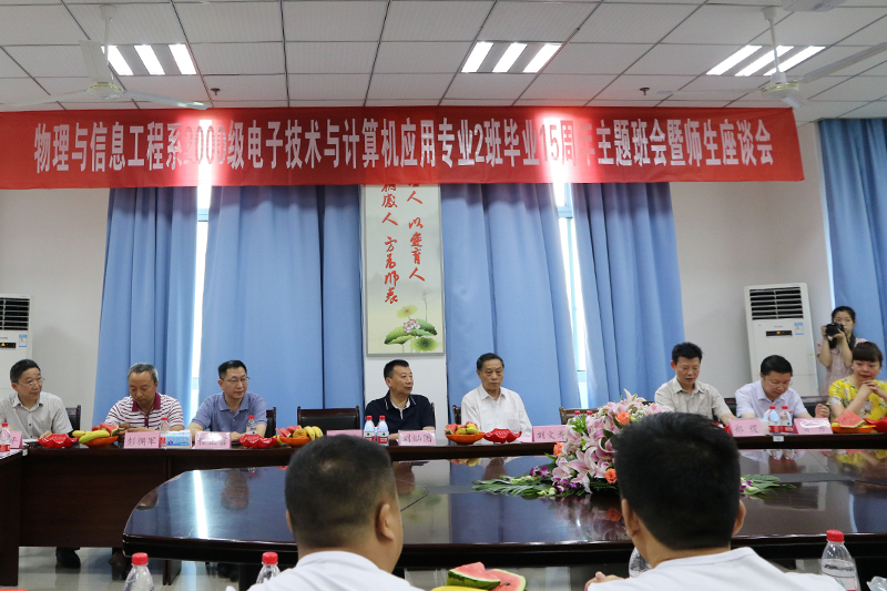 5月19-20日,beat365官网电子电气工程学院2000级电子技术与计算机应用专业2班校友相聚母校,举行“星湖桃花缘,萦梦十五载”毕业十五周年同学会。5月20日上午,在红河B区格术楼C301会议室举行师生座谈会。学校党委副书记、校友会常务副会长刘灿国,校友总会秘书长谢华琳,电子电气工程学院相关领导、任课教师50人参加了会议。