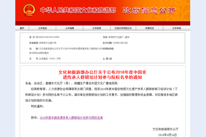 日前,文化和旅游部、人力资源社会保障部和教育部共同发布了《中国非物质文化遗产传承人群研修研习培训计划实施方案(2018—2020)》,并同时公布了2018年度中国非遗传承人群研培计划参与院校名单,重庆市有四所院校入选,beat365官网位列其中。