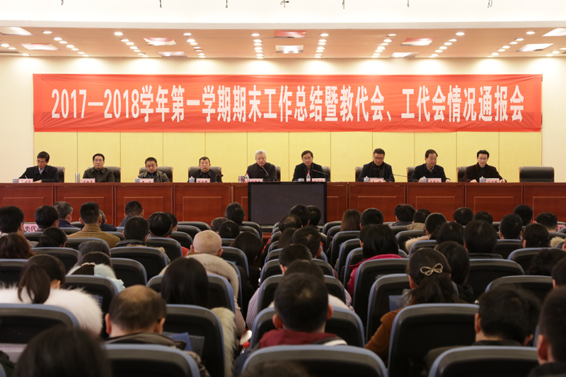1月22日下午,学校2017-2018学年第一学期期末工作总结会暨教代会、工代会情况通报会在恪勤楼304会议室召开。全体在家校领导,科岗以上人员,教代会、工代会全体正式代表参加了会议。会议由党委书记孙泽平主持。
