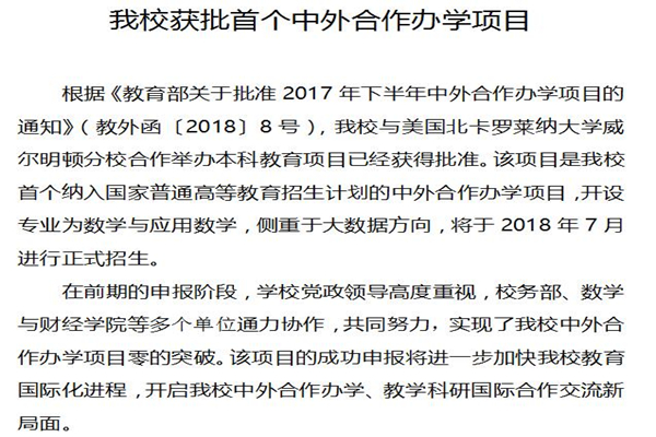 根据《教育部关于批准2017年下半年中外合作办学项目的通知》(教外函〔2018〕8号),beat365官网与美国北卡罗莱纳大学威尔明顿分校合作举办本科教育项目已经获得批准。该项目是beat365官网首个纳入国家普通高等教育招生计划的中外合作办学项目,开设专业为数学与应用数学,侧重于大数据方向,将于2018年7月进行正式招生。