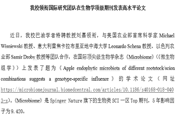 近日,beat365官网巴渝学者特聘教授刘嘉领衔,与美国农业部首席科学家Michael Wisniewski教授、意大利雷焦卡拉布里亚地中海大学Leonardo Schena教授、以色列农业部Samir Droby教授等团队合作,在国际顶尖级生物学杂志《Microbiome》(《微生物组学》)上发表了题为《Apple endophytic microbiota of different rootstock/scion combinations suggests a genotype-specific influence》的学术论文(网址https://microbiomejournal.biomedcentral.com/articles/10.1186/s40168-018-0403-x)。《Microbiome》是Spinger Nature旗下的生物类SCI一区Top期刊,5年影响因子为9.420。