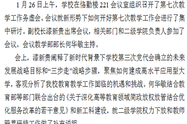 1月26日上午,学校在恪勤楼221会议室组织召开了第七次教学工作务虚会。会议就新形势下如何开好第七次教学工作会进行了集中研讨。副校长漆新贵出席会议,相关部门和二级学院负责人参加了会议。会议教学部部长何华敏主持。