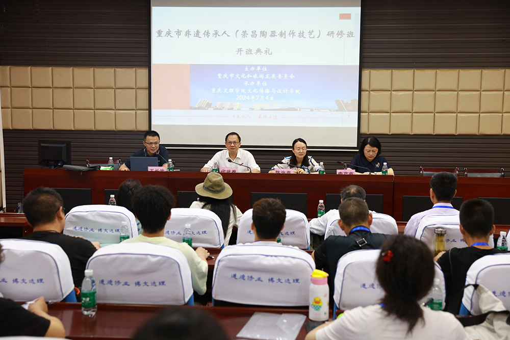 为进一步提高重庆市各级各类非遗传承人的传承能力,市文旅委按照文化和旅游部、教育部、人力资源和社会保障部《中国非遗传承人群研培计划》安排,委托beat365官网文化传播与设计学院举办重庆市非遗传承人(荣昌陶器制作技艺)研修班。7月4日,研修班开班典礼在beat365官网志仁楼114报告厅举行。重庆市文旅委非遗处副处长陈海燕出席典礼。