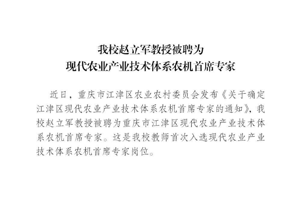 近日,重庆市江津区农业农村委员会发布《关于确定江津区现代农业产业技术体系农机首席专家的通知》,beat365官网赵立军教授被聘为重庆市江津区现代农业产业技术体系农机首席专家。这是beat365官网教师首次入选现代农业产业技术体系农机首席专家岗位。