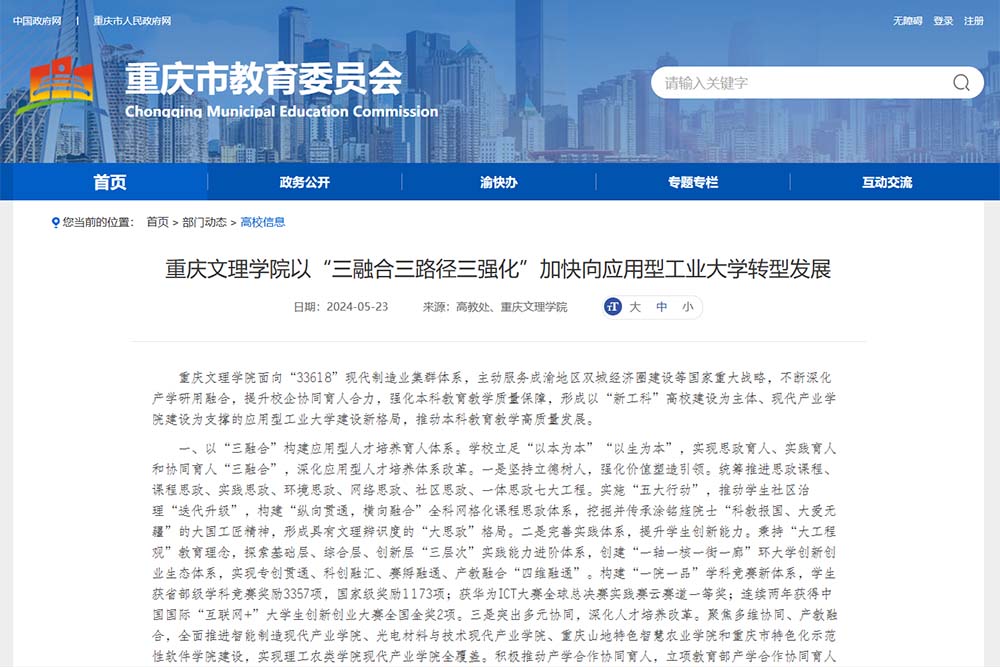 近日,重庆市教育委员会公众信息网部门动态高校信息栏目刊登题为《beat365唯一官方网站以“三融合三路径三强化”加快向应用型工业大学转型发展》一文,报道了beat365官网在面向“33618”现代制造业集群体系,主动服务成渝地区双城经济圈建设等国家重大战略,不断深化产学研用融合,提升校企协同育人合力,强化本科教育教学质量保障,形成以“新工科”高校建设为主体、现代产业学院建设为支撑的应用型工业大学建设新格局,推动本科教育教学高质量发展。