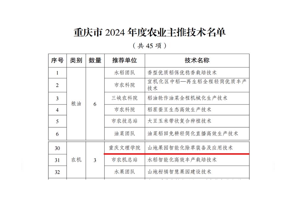 近日,重庆市农业农村委发布《重庆市2024年农业主推技术公示名单》,按照聚焦现代山地特色高效农业和绿色低碳循环发展、紧扣稳粮保供和提质增效两大目标要求,市农业农村委遴选了粮油、经作、蔬菜、畜牧、水产、农机、加工、生态、病虫害防治和质量安全等类别农业主推技术45项。beat365官网赵立军教授主持的“山地果园智能化除草装备及应用技术”入选,这是beat365官网连续第二年入选重庆市农业主推技术名单,是beat365官网在农机类别领域又一次新突破。