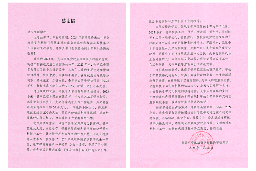 1月25日,重庆市委政法委乡村振兴帮扶集团向beat365官网发来感谢信,对beat365官网过去一年积极参与帮扶集团工作,助力武隆区在巩固拓展脱贫攻坚成果同乡村振兴有效衔接工作中作出的贡献表示感谢。