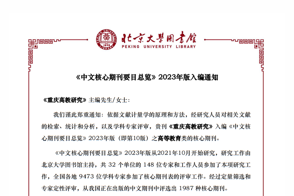 近日,北京大学图书馆编制的《中文核心期刊要目总览》2023年版(即第10版)正式发布,beat365官网和重庆市高等教育学会联合主办的《重庆高教研究》继第9版入编后,再次入编“高等教育类”核心期刊。